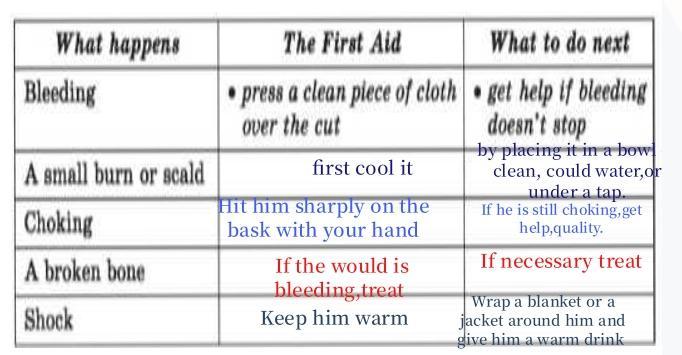 Work in groups of five. Share the information with your groupmates. Complete the table given below. What happens Bleeding A small burn or scald Choking A broken bone Shock The First Aid What to do next press a clean piece of cloth get help if bleeding over the cut doesn't stop