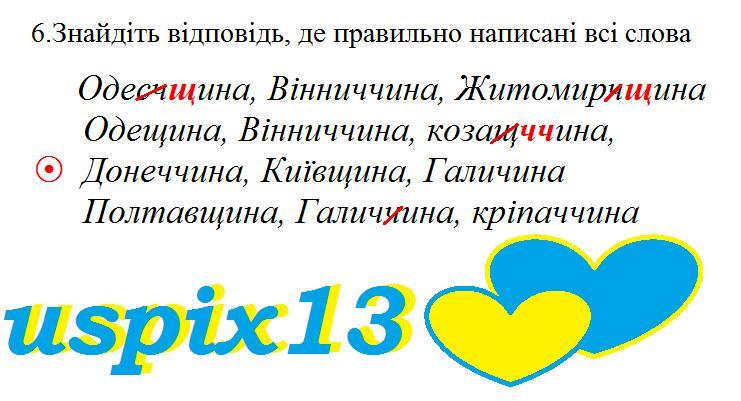 6.Знайдіть відповідь, де правильно написані всі слова Одесчина, Вінниччина, Житомирчина Одещина, Вінниччина, козащина, Донеччина, Київщина, Галичина Полтавщина, Галиччина, кріпаччина