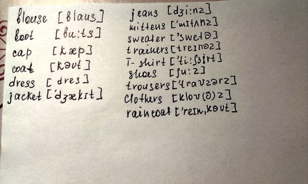 заделайте трансприкцыю и перевод этих слов срочно помогите blouse, boots, cap, coat, dress, jacket,, jeans, mittens, sweater, trainers, T-shirt, shoes, trousers, clothes, raincoat