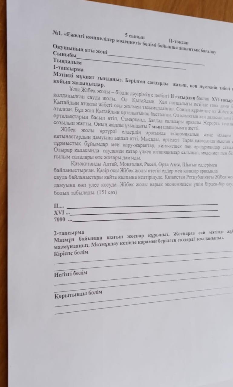 5 сынып И-токсан №1. «Ежелгi көшпелілер мәдениеті, болімі бойынша жиынтык багалау Окушынын аты женi Сыныбы Тындалым 1-тапсырма Мәтiндi мукият тынданыз. Берілген сандарды жазып, коп нуктенін тиісті сездерді койып жазыныздар. Ұлы Жiбек жолы - бiздiн дауiрiмiзге дейiнгi II гасырдан бастап XVI гасыр колданылган сауда жолы. Ол Кытайлын Хан патшалыгы кенде гана дами баст Кытайдын атакты жiбегi осы жолмен тасымалданган. Сонын курметiне ол Жібек жолы аталған. Бұл жол Кытайдын орталыгынан басталган. Ол казактын кен даласындагы орталыктарын басып етiп, Самарканд. Багдал калалары аркылы Жерорта текiзiне дей созылып жатты. Онын жалпы узынлыгы 7 мын шакырымга жетті. Жiбек жолы әртүрлі елдердін арасында экономикалык және мәдени карым катынастардын дамуына ыкпал етті. Мысалы, ертедегі Тараз каласыныстан тұрмыстык бұйымдар мен кару-жарактар, киiм-кешек пен ер-тұрмандар сатылган. Ал Отырар каласында саудамен катар улкен кітапханалар салынып, мадениет пен бiлiм және Ғылым салалары өте жогары дамыды. Казакстанды Алтай, Монголия. Ресей, Орта Азия. Шығыс елдерiмен байланыстырған. Қазір осы Жiбек жолы өтетiн елдер мен калалар арасында сауда байланыстары кайта калпына келтiрiлуде, Казакстан Республикасы Жiбек жолынын дамуына кеп улес косуда. Жiбек жолы нарык экономикасы ушiн бiрден-бір сауда ко болып табылады. (151 сез) II.... XVI ... 7000 2-тапсырма Мазмұн бойынша шагын жоспар кұрыныз. Жоспарга сай мәтінді жұбыны мазмұнданыз. Мазмұндау кезінде карамен берілген сөздерді колданыныт. Кіріспе бөлім Негiзгi бөлiм Қорытынды бөлім