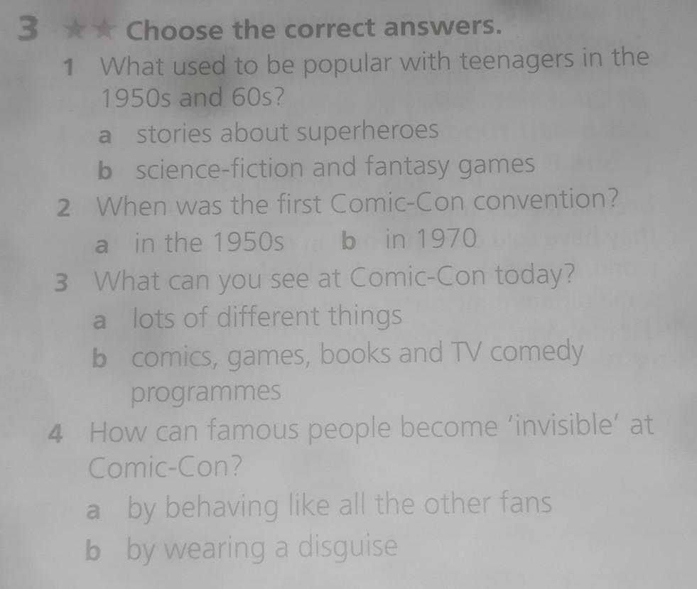 3** Choose the correct answers. 1 What used to be popular with teenagers in the 1950s and 60s? a stories about superheroes bscience-fiction and fantasy games 2 When was the first Comic-Con convention? a in the 1950s b in 1970 3 What can you see at Comic-Con today? a lots of different things b comics, games, books and TV comedy programmes 4 How can famous people become 'invisible at Comic-Con? a by behaving like all the other fans b by wearing a disguise
