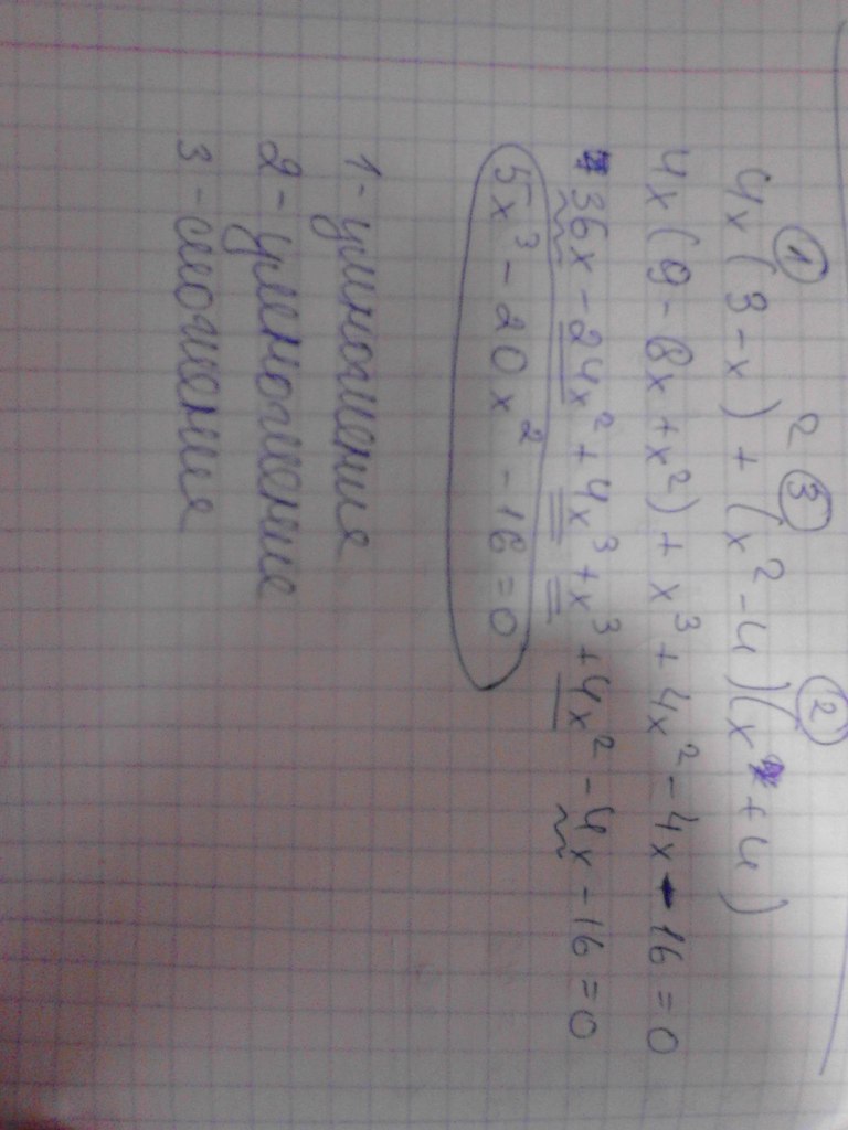 какие действия надо выполнить и в каком порядке, чтобы представить целое выражение 4х(3-х)кв + (хкв -4)(х+4) в виде многочлена???? решите прошу!