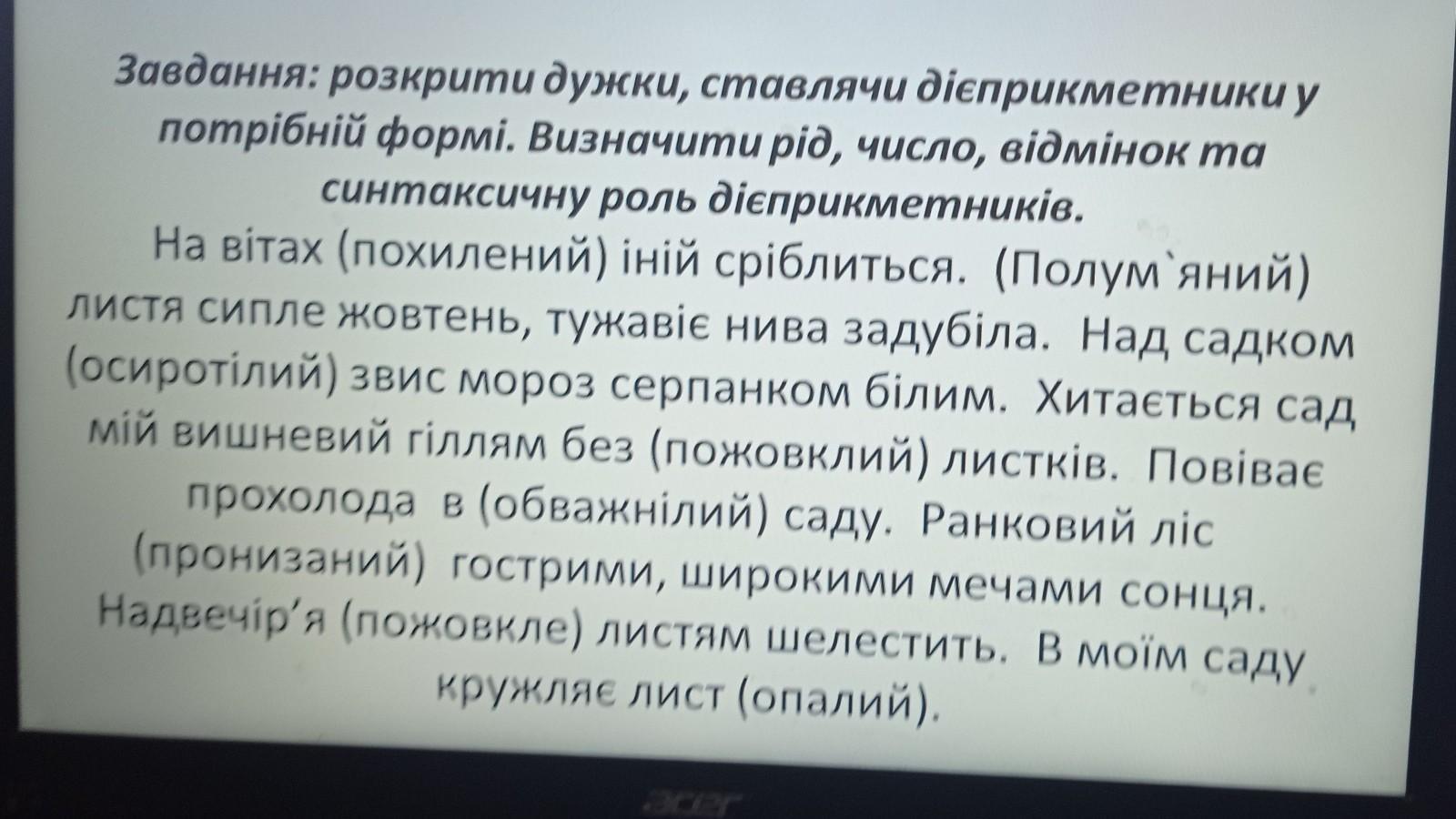 .S Завдання: розкрити дужки, ставлячи дієприкметники у потрібній формі. Визначити рід, число, відмінок та синтаксичну роль дієприкметників. На вітах (похилений) іній сріблиться. (Полум`яний) листя сипле жовтень, тужавіє нива задубіла. Над садком (осиротілий) звис мороз серпанком білим. Хитається сад мій вишневий гіллям без (пожовклий) листків. Повіває прохолода в (обважнілий) саду. Ранковий ліс (пронизаний) гострими, широкими мечами сонця. Надвечір'я (пожовкле) листям шелестить. В моїм саду кружляє лист (опалий).