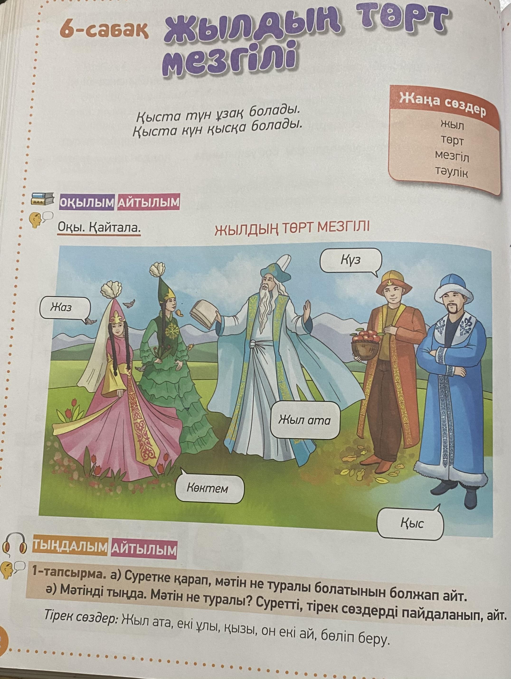 1-тапсырма. а) Суретке қарап, мәтін не туралы болатынын болжап айт. ә) Мәтінді тыңда. Мәтін не туралы? Суретті, тірек сөздерді пайдаланып, айт.Тірек сөздер: Жыл ата, екі ұлы, қызы, он екі ай, бөліп беру.