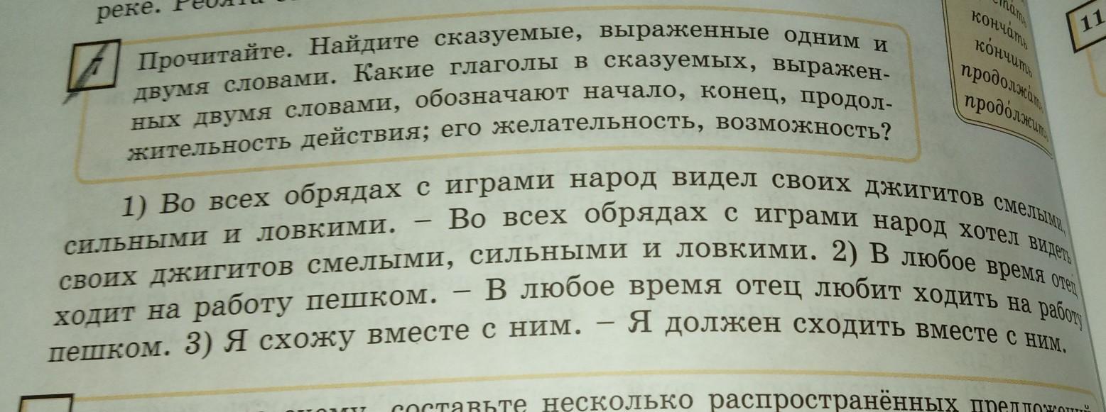 Прочитайте. Найдите сказуемые, выраженные одним и двумя словами. Какие глаголы в сказуемых, выражен- ных двумя словами, обозначают начало, конец, продол- жительность действия; его желательность, возможность? - 1) Во всех обрядах с играми народ видел своих джигитов смелыми, Во всех обрядах с играми народ хотел видеть своих джигитов смелыми, сильными и ловкими. 2) В любое время оте ходит на работу пешком. В любое время отец любит ходить на работ- сильными и ловкими. пешком. 3) Я схожу вместе с ним. Я должен сходить вместе с ним.