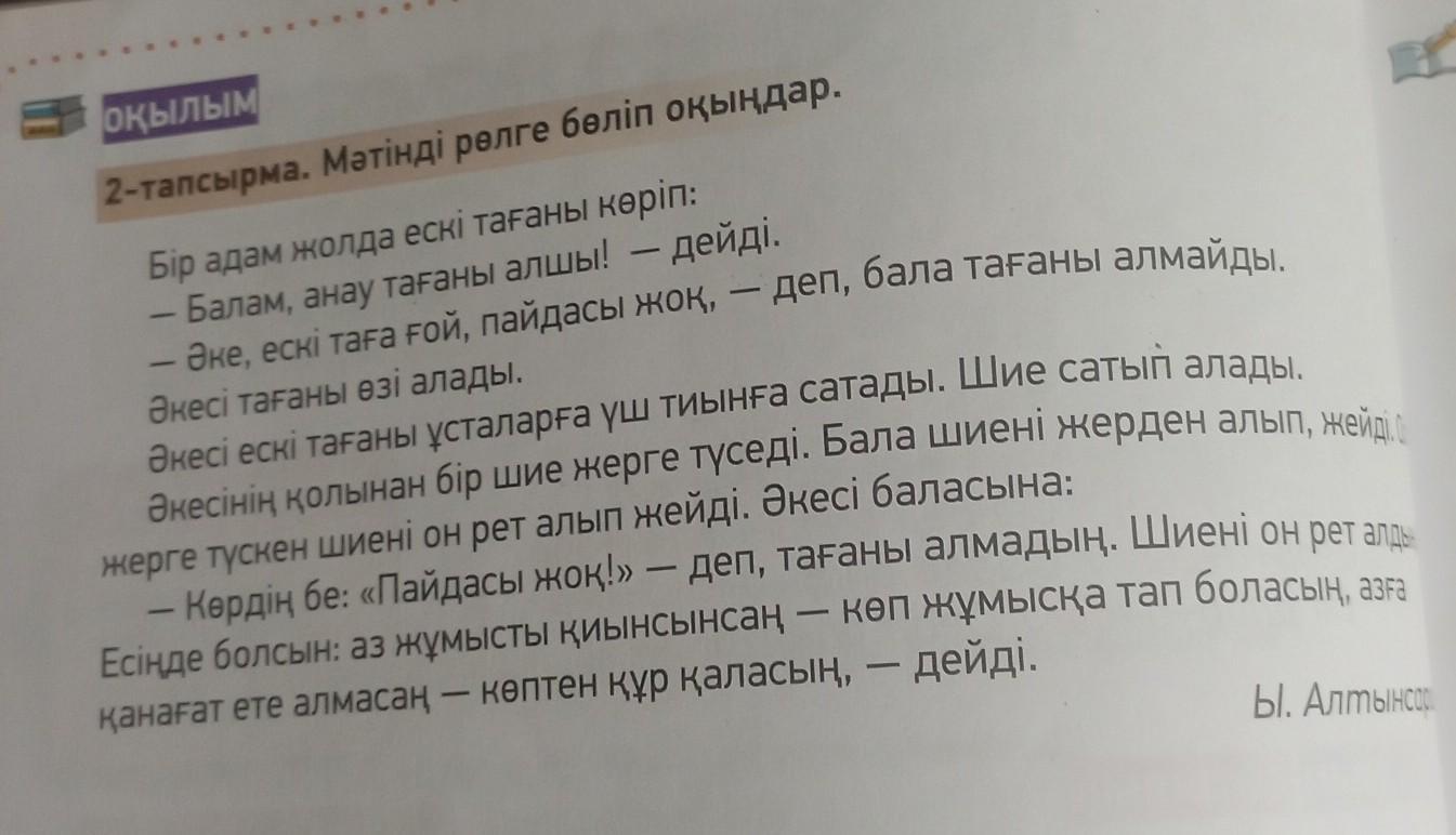 - окылым 2-тапсырма. Мәтiндi релге белiп окындар. Бiр адам жолда ескi тағаны керiп: Балам, анау тағаны алшы! - дейді. - Әке, ескi таға ғой, пайдасы жок, - деп, бала тағаны алмайды. Әкесі тағаны өзі алады. Әкесі ескi тағаны усталарға уш тиынға сатады. Шие сатып алады. Әкесiнiң колынан бір шие жерге түседі. Бала шиені жерден алып, жейд жерге түскен шиені он рет алып жейді. Әкесі баласына: - Кердiң бе: «Пайдасы жок!» - деп, тағаны алмадың. Шиені он рет алда Есiнде болсын: аз жумысты киынсынсаң - көп жұмысқа тап боласың, азға канағат ете алмасаң - көптен құр қаласың, - дейді. Ы. Алт пожалуйста помогите срочно