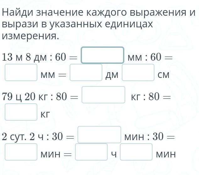 Найди значение каждого выражения и вырази в указанных единицах измерения. 13 м 8 дм : 60 MM = - 79 ц 20 кг : 80 - КГ 2 сут. 2 ч : 30 = мин = - ДМ 니 мм : 60 = CM кг: 80 - мин : 30 - мин