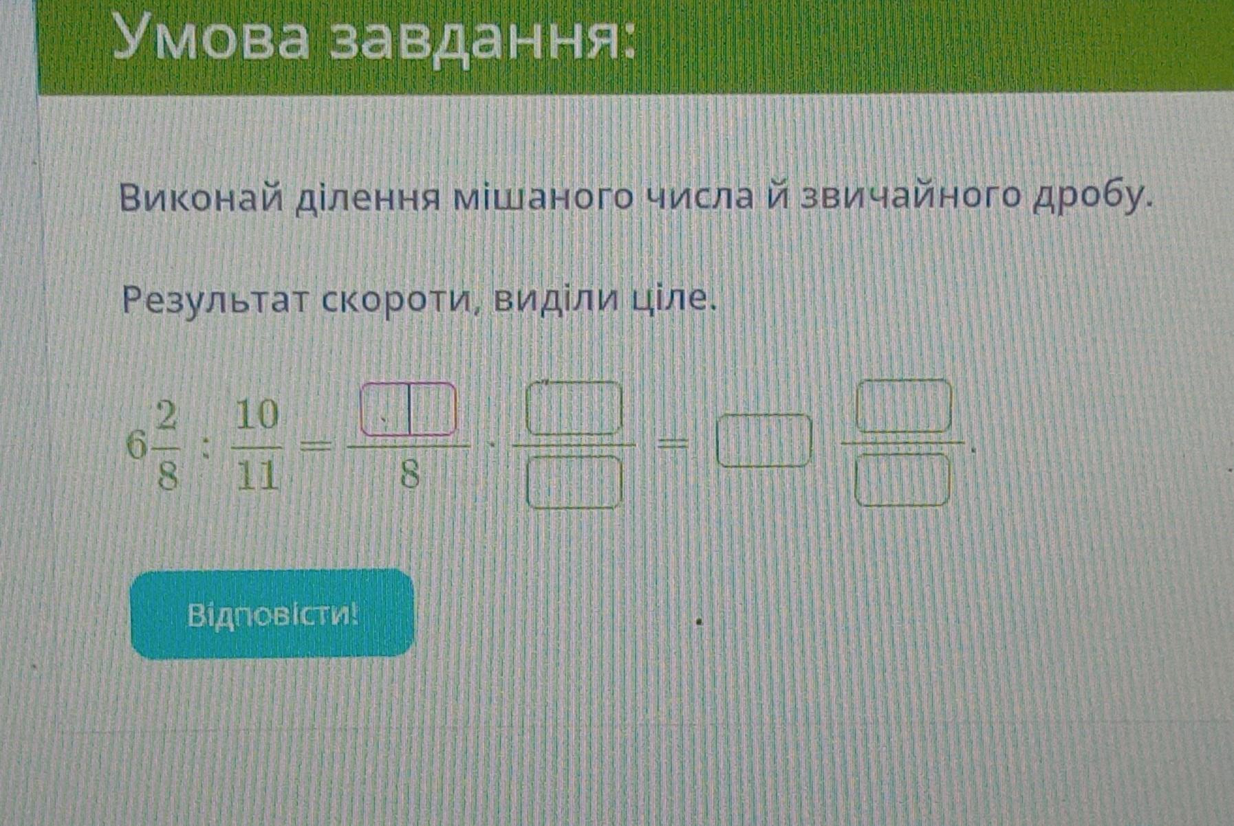 Виконай ділення мішаного числа й звичайного дробу. Результат скороти, виділи ціле. 6 2/8 : 10/11 = ? / 8. ? /? = ? ?/? .