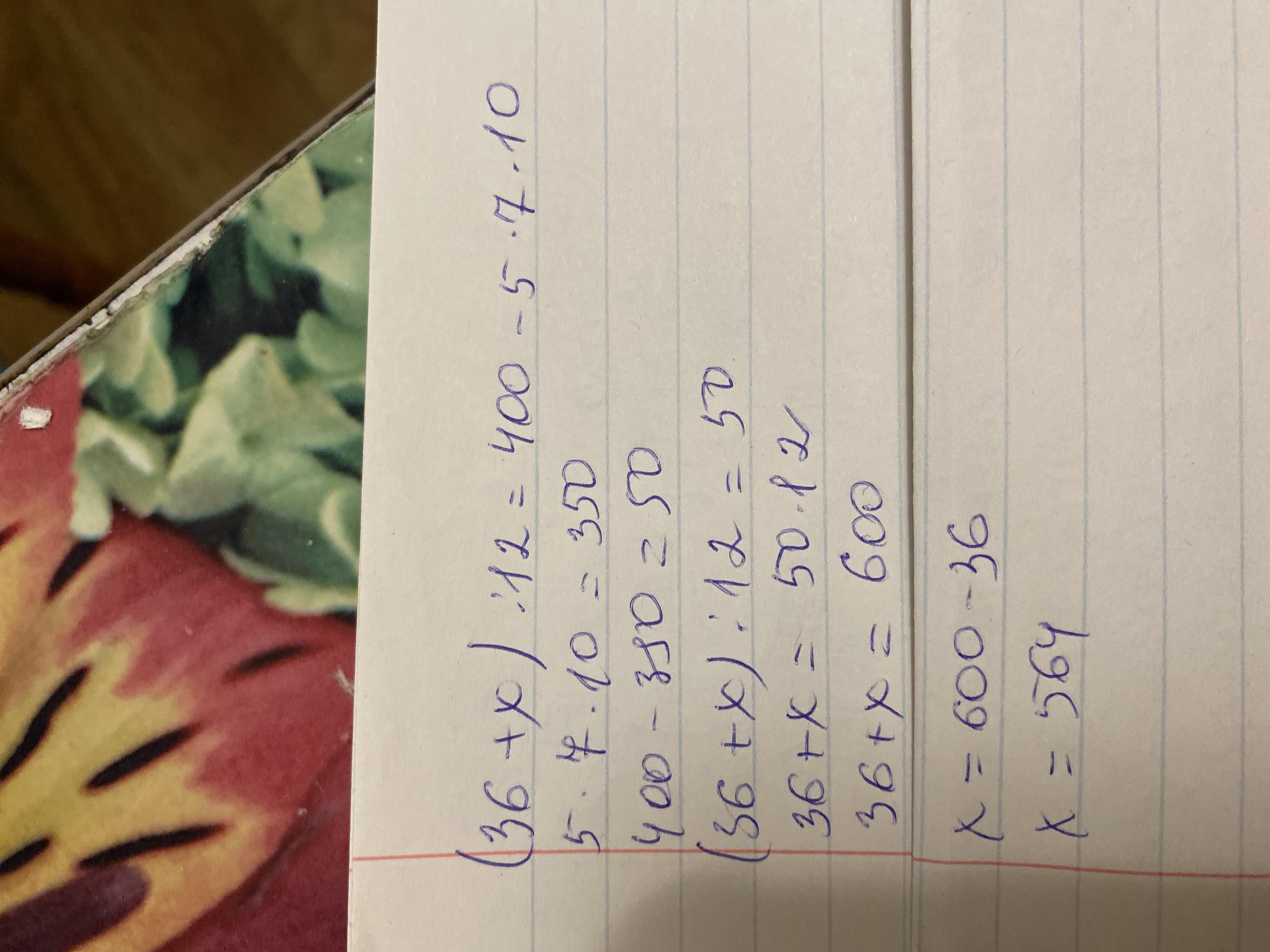 Упростим правую сторону уравнения: 400 - 5•7•10 = 400 - 350 = 50. Затем подставим это значение в исходное уравнение: (36+x) / 12 = 50. Умножим обе стороны уравнения на 12: 36 + x = 600. Вычтем 36 из обеих сторон: x = 564. Таким образом, решением уравнения является x = 564.