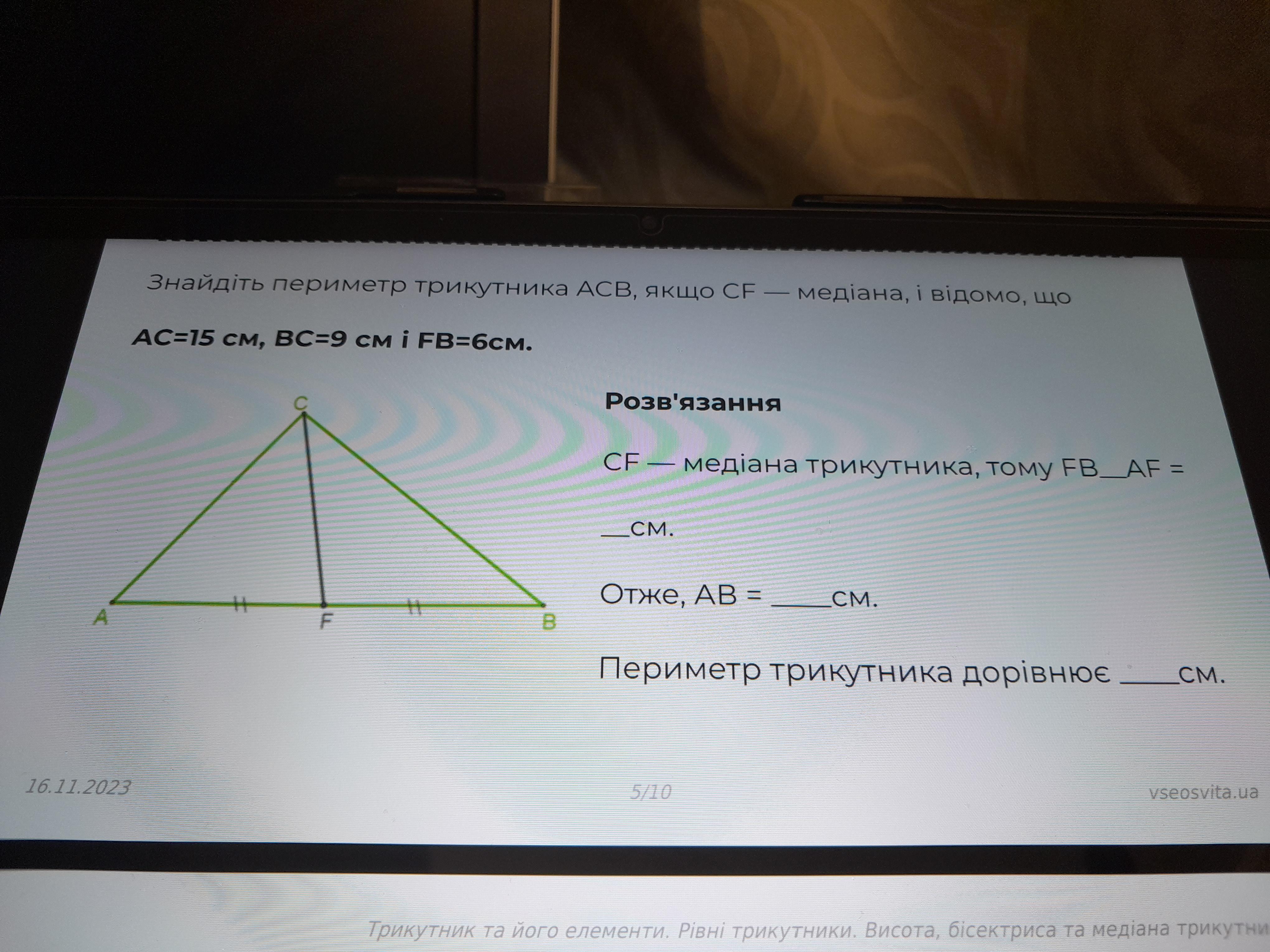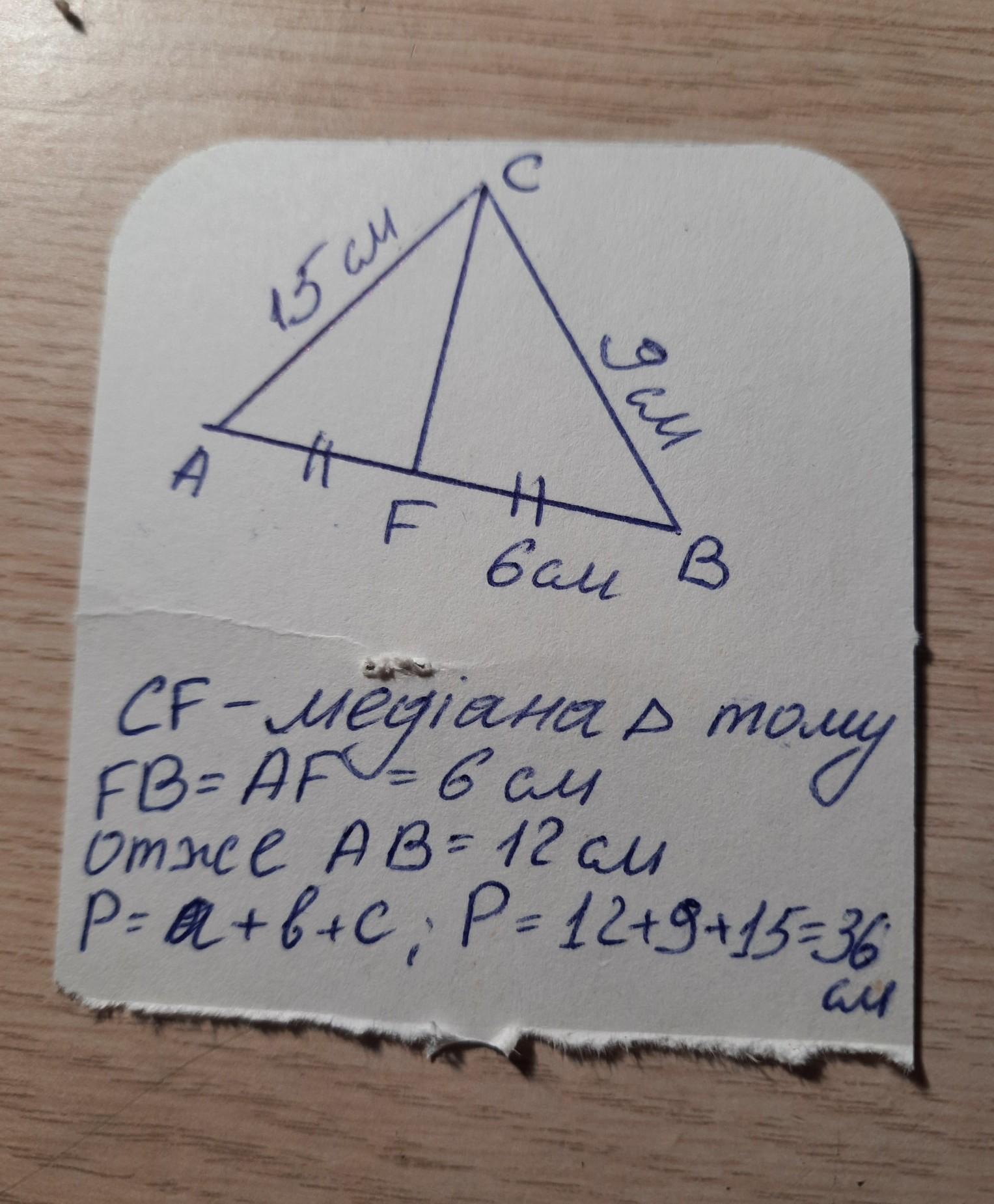 Знайдіть периметр трикутника АСВ, якщо CF - медіана, і відомо, що AC=15 см, ВС=9 см і FB-6см.