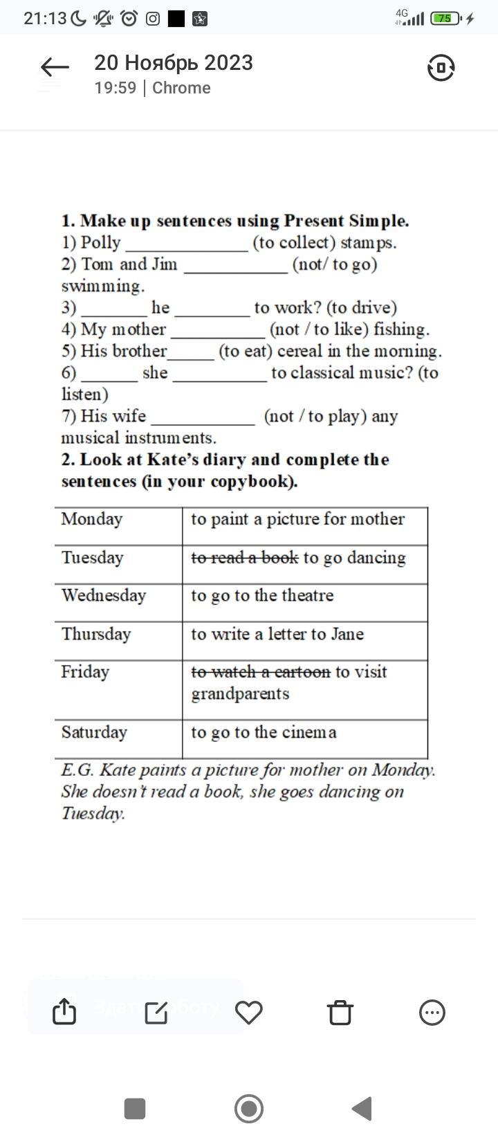 2) 1. Kate paints a picture for mother on Monday.
