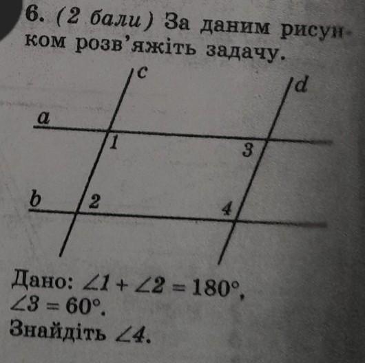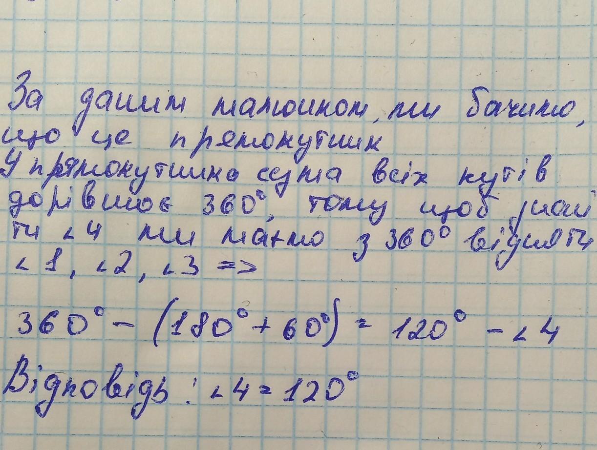 Оскільки кути <1 і <2 односторонні, то їх сума дорівнює 180°. Тоді а||б. Тоді <3 і <4 також односторонні. <4=180°-60°=120°