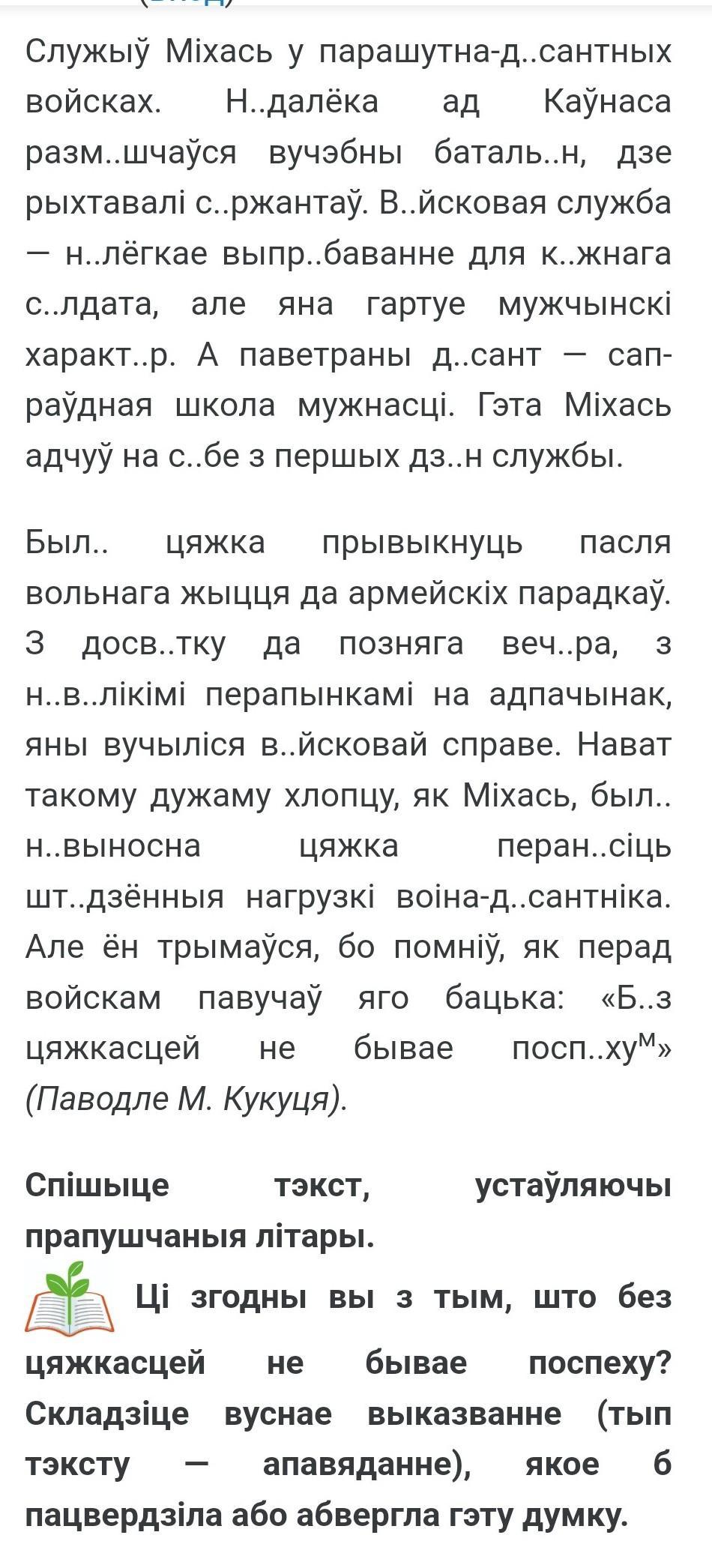 "Служыў Міхась у парашутна-десантных войсках. Недалёка ад Каўнаса размешчаўся вучебны батальён, дзе рыхтавалі сержантаў. Войсковая служба не лёгкае выпрабаванне для кожнага салдата, але яна гартуе мужчынскі характар. А паветраны десант сапраўдная школа мужнасці. Гэта Міхась адчуў на сабе з першых дзён службы. Была цяжка прывыкнуць пасля вольнага жыцця да армейскіх парадкаў. З досведку да позняга вечара, з невялікімі перапынкамі на адпачынак, яны вучыліся войсковай справе. Нават такому дужаму хлопцу, як Міхась, была нявыносная цяжка пераносіць штодзённыя нагрузкі воіна-десантніка. Але ён трымаўся, бо помняў, як перад войскам павучаў яго бацька: «Без цяжкасцей не бывае поспеху (Паводле М. Кукуця)."