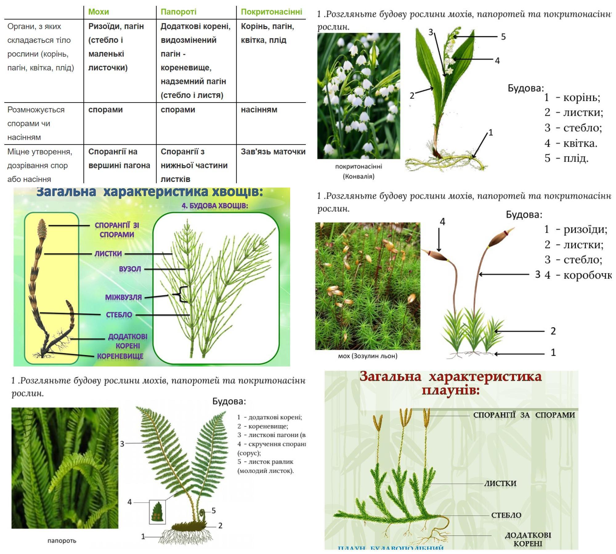 Особливості будови мохів, папоротей та покритонасінних рослин