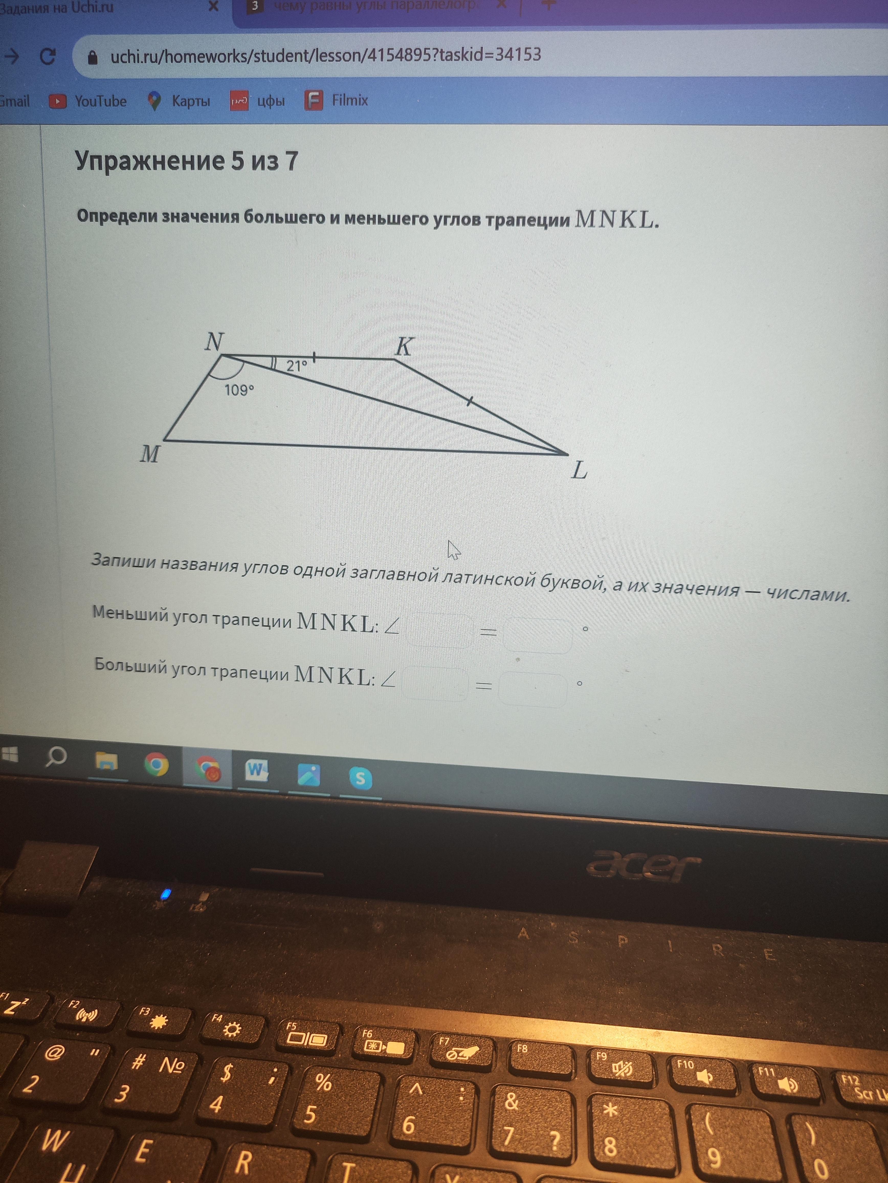 ∠MNK = 109° + 21° = 130° ; ∠K = 180° - 2* 21° = 138° .