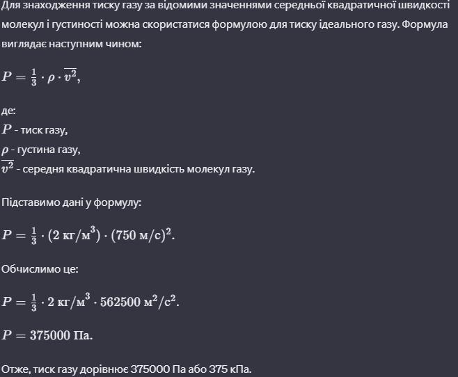 Який тиск газу, якщо середня квадратична швидкість його молекул 750м/с, а