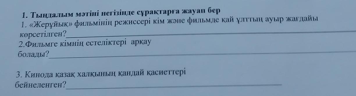1. Тыңдалым мәтіні негізінде сұрақтарға жауап бер 1. «Жерұйық» фильмінің режиссері кім және фильмде кай улттын ауыр жагдайы көрсетілген? 2.Фильмге кімнің естеліктері арқау болады? 3. Кинода казақ халқының қандай қасиеттерi бейнеленген?