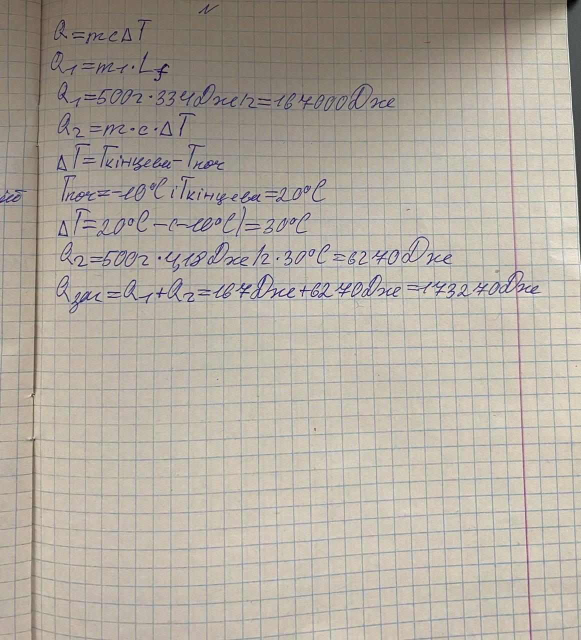 Для розплавлення 500 г льоду при температурі -10 °C і нагрівання отриманої води до 20 °C потрібно 173270 Дж теплоти.