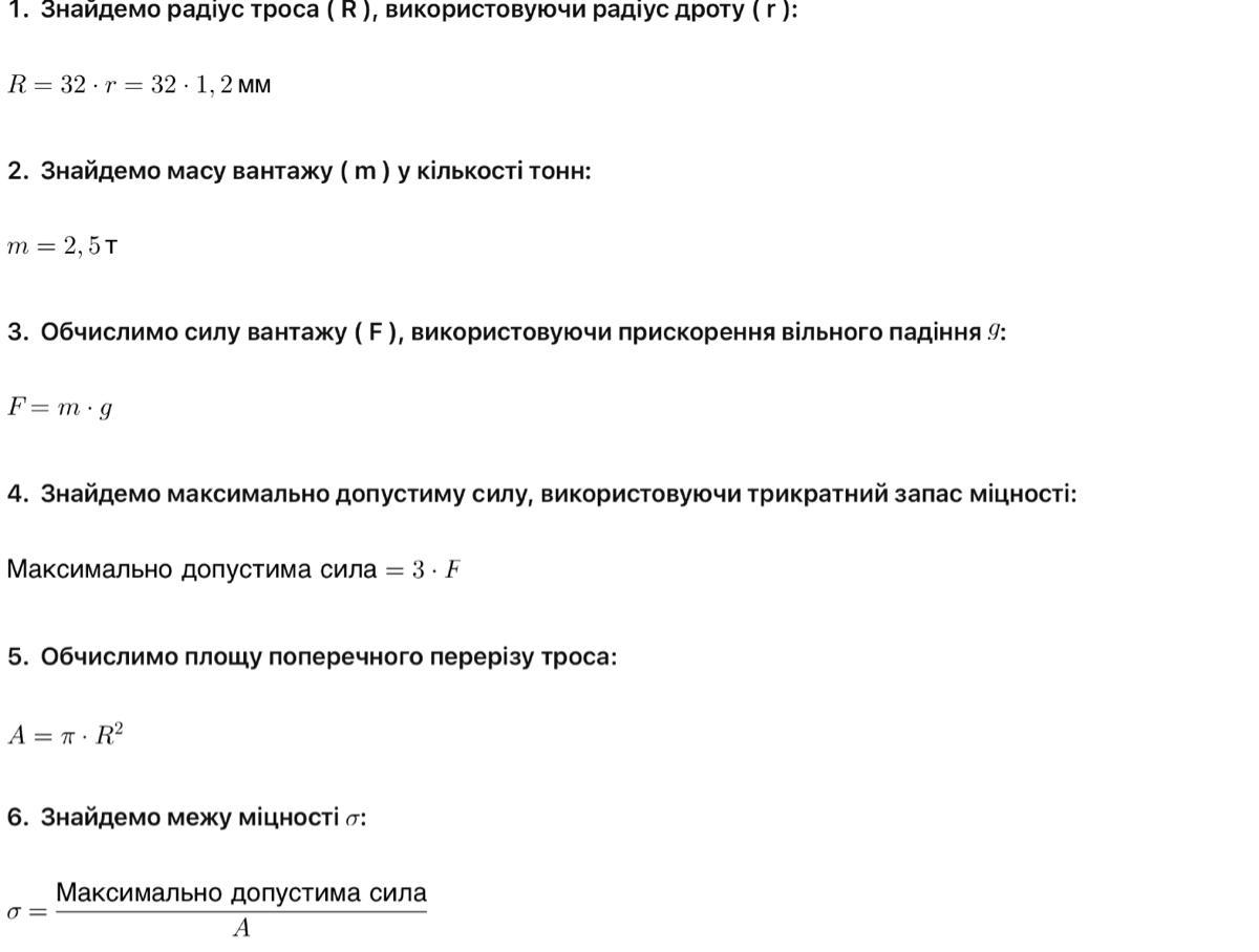 Визначте межу міцності троса, плетеного з 32 дроті радіусом 1,2 мм, якщо з його допомогою можна підня-ти вантаж масою 2,5 т при трикратному запасі міцності.