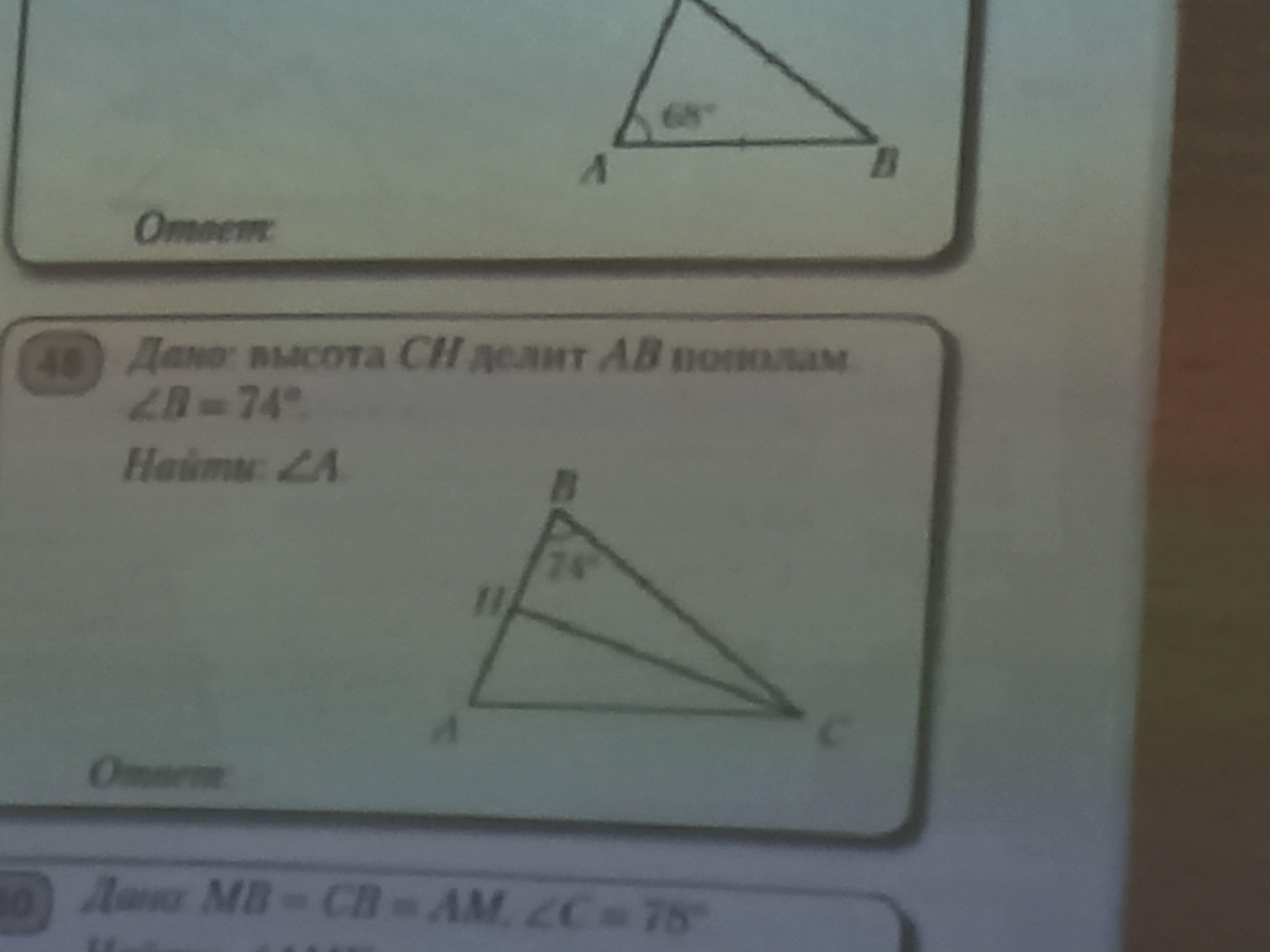 Если высота треугольника совпадает с его медианой - то такой треугольник равнобедренный. По условию мы можем понять, что CH - это медиана, так как она делит сторону по пополам и также знаем, что CH - высота. => Треугольник равнобедренный. По свойству равнобедренного треугольника(углы при основании равны) ∠А = ∠B = 74°