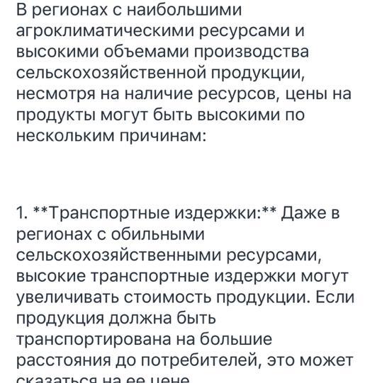 В регионах с наибольшими агроклиматическими ресурсами и высокими объемами производства сельскохозяйственной продукции, несмотря на наличие ресурсов, цены на продукты могут быть высокими по нескольким причинам: