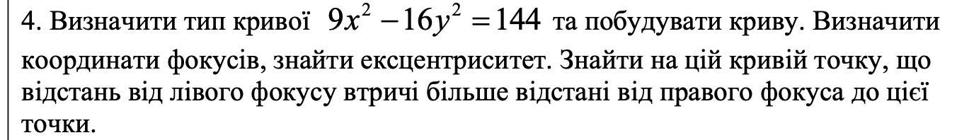 4. Визначити тип кривої 9х2 −16у2 =144 та побудувати криву. Визначити