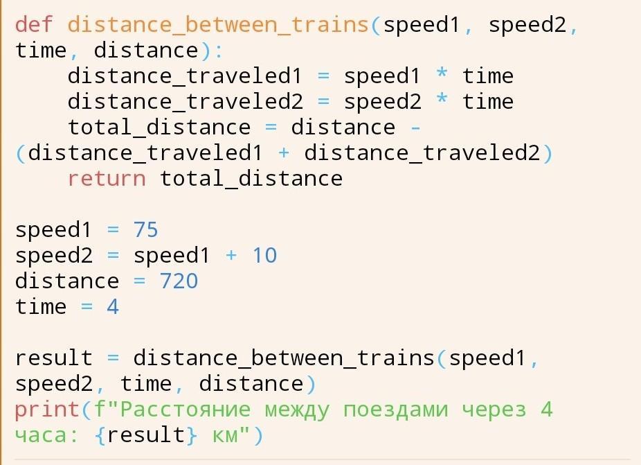 Эта программа сначала определяет функцию distance_between_trains, которая принимает скорость первого поезда, скорость второго поезда, время и общее расстояние между станциями. Затем программа использует эту функцию для вычисления расстояния между поездами через 4 часа с заданными скоростями и расстоянием.