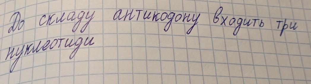 Укажіть кількість нуклеотидів, що входять до складу антикодону: а) 3; б) 1; в) 2; г) 4;