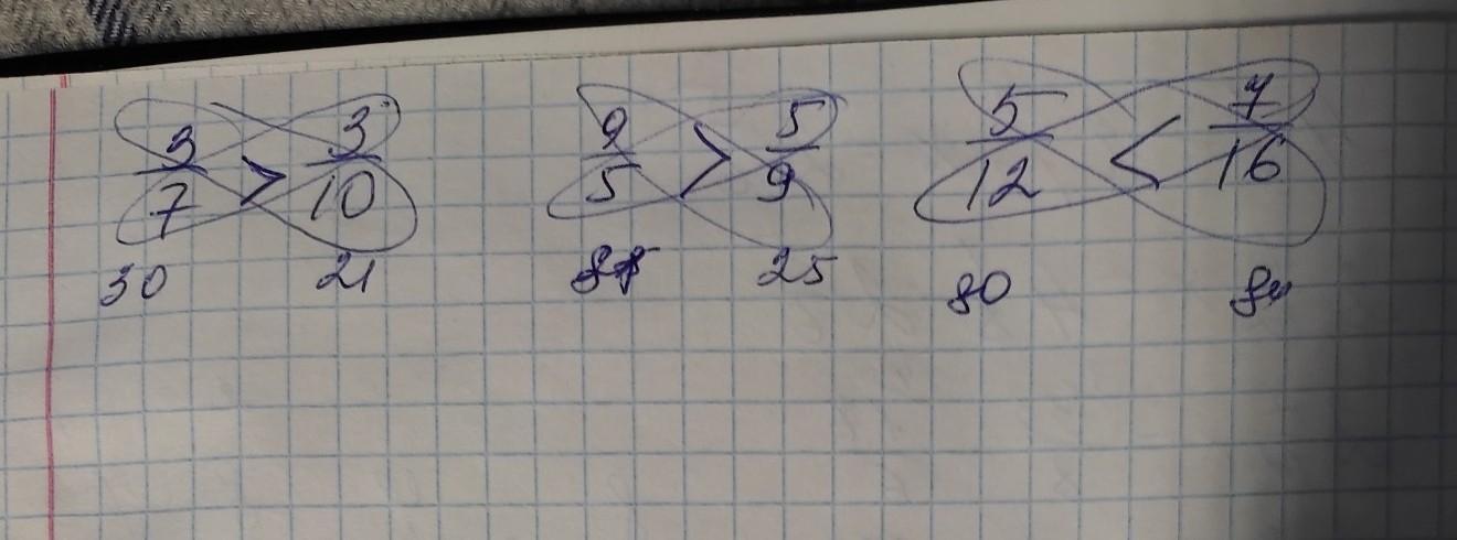 3/7>3/10 , 9/5>5/9 , 5/12<7/16 .
