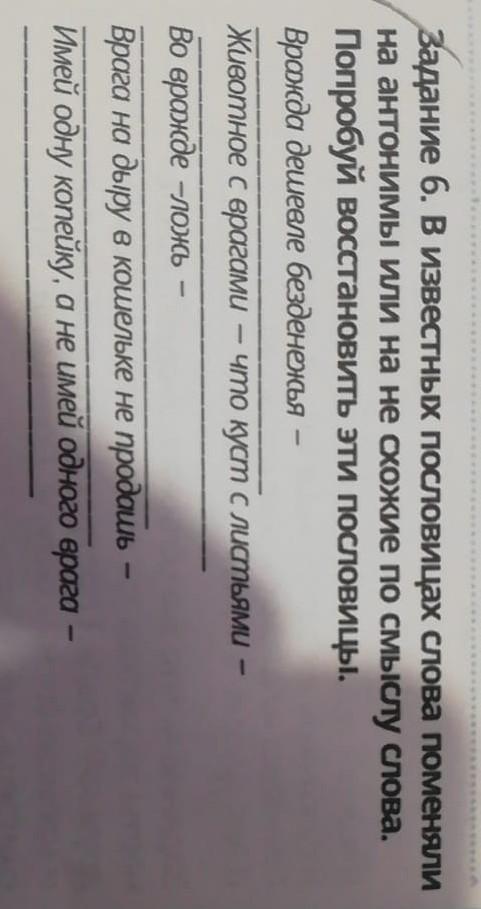 Задание 6. В известных пословицах слова поменяли на антонимы или на не схожие по смыслу слова. Попробуй восстановить эти пословицы. Вражда дешевле безденежья -