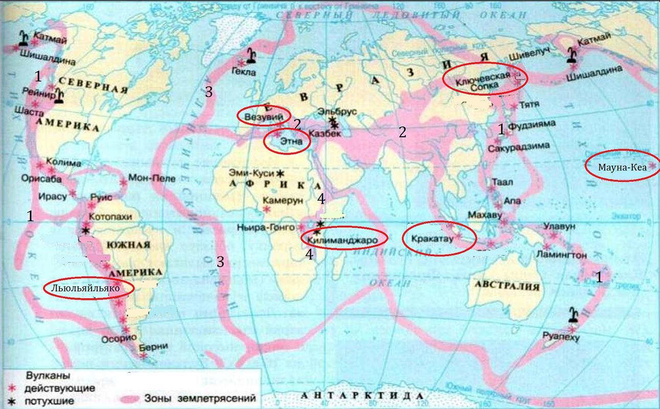 Позначте на контурній карті Тихоокеанський, Середземноморсько-Трансазійський, Серединноатлантичний, Східноафриканський сейсмічні пояси, а також вулкани Кракатау,