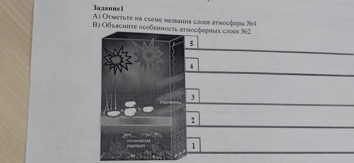 Задание1 А) Отметьте на схеме названия слоев атмосферы №4 В) Объясните особенность атмосферных слоев №2 ви рителя 4 3 2 1