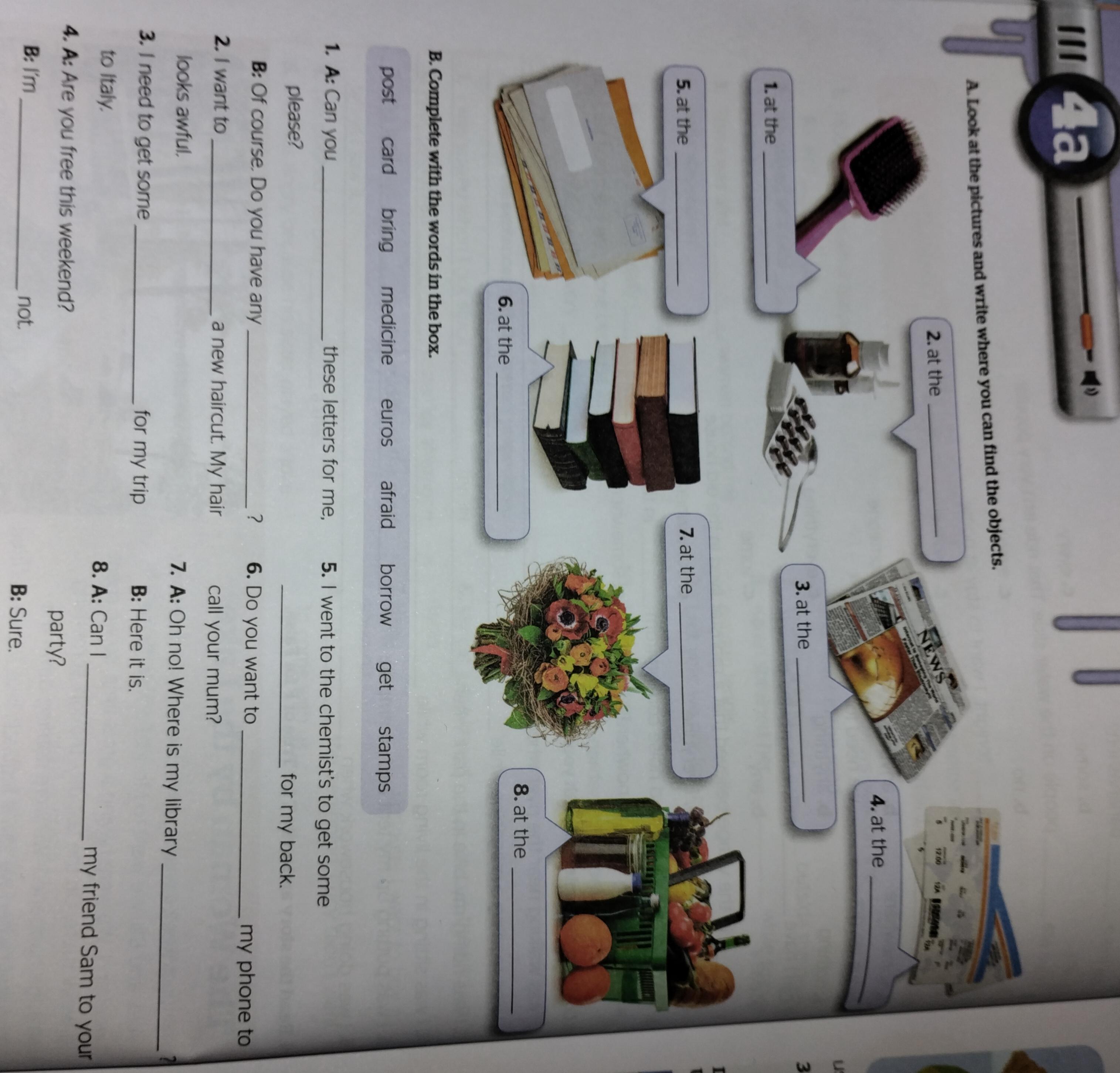 1 comb, 2 medicine, 3 Newspaper, 4 tickets, 5 letter, 6 books, 7 flowers, 8 Products