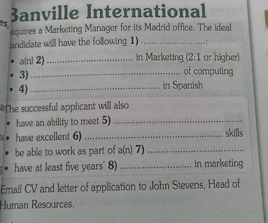 Banville International requires a Marketing Manager for its Madrid office. The ideal candidate will have the following 1) a(n) 2).... in Marketing (2:1 or higher) of computing 3).. 4)..... in Spanish ● E The successful applicant will also • have an ability to meet 5)......... • have excellent 6).…..... • be able to work as part of a(n) 7) • have at least five years' 8) ..... skills in marketing Email CV and letter of application to John Stevens, Head of Human Resources.