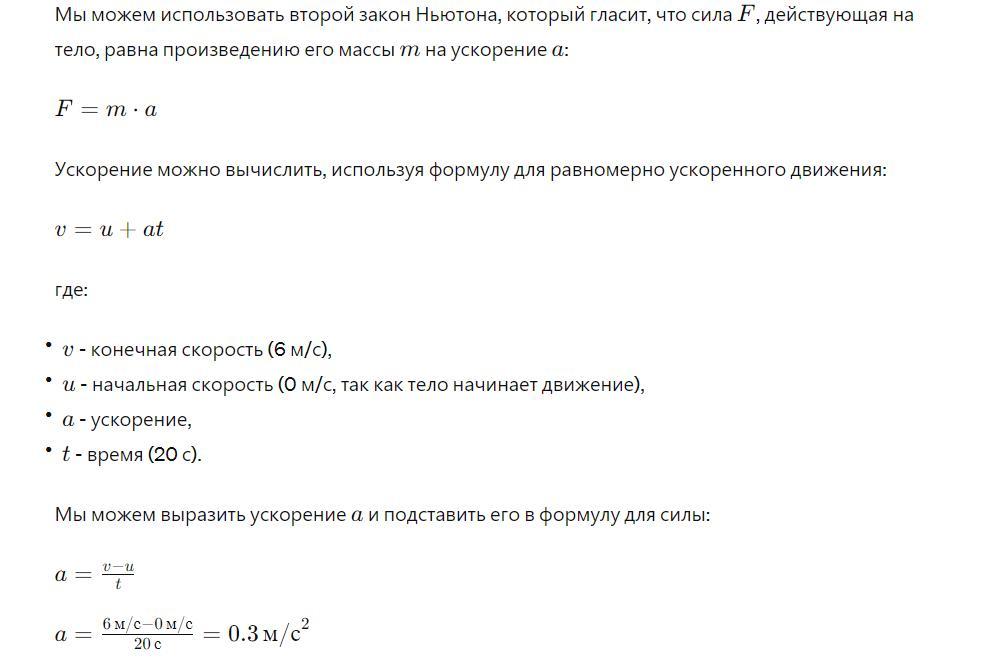 тело массой 15 кг начало движения по действиям постоянной силы его скорость в конце 20 секунды стало 6 м/с. Определите силу, действующую на тело.