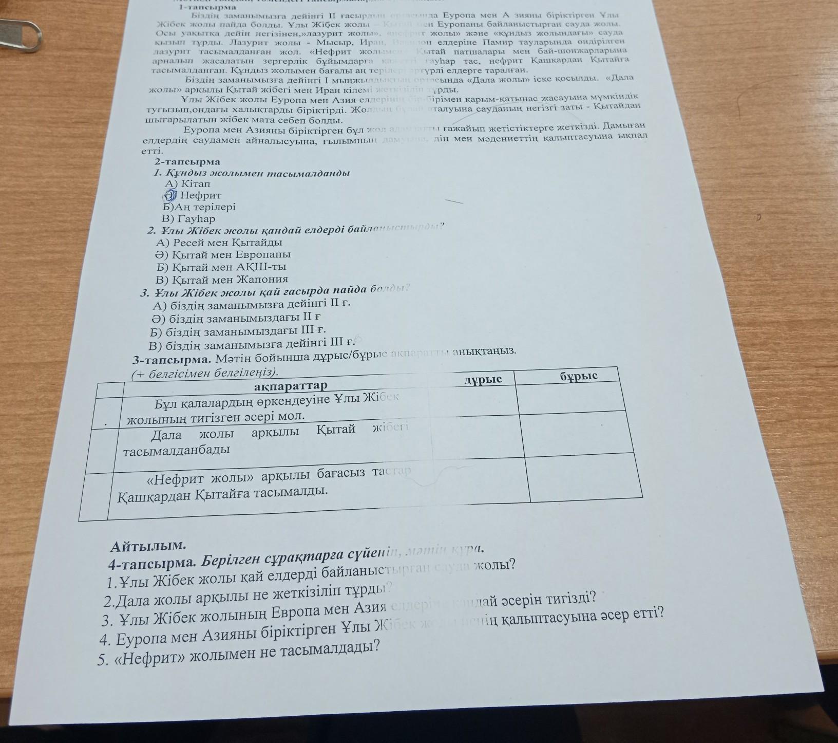 3-тапсырма. Мәтін бойынша дұрыс/бұрыс акпаратты анықтаңыз. (+ белгісімен белгілеңіз). дұрыс ақпараттар Бұл қалалардың өркендеуіне Ұлы Жібек жолының тигізген әсері мол. Дала жолы арқылы Қытай жiбегi тасымалданбады «Нефрит жолы» арқылы бағасыз тастар Қашқардан Қытайға тасымалды. бұрыс дурыс