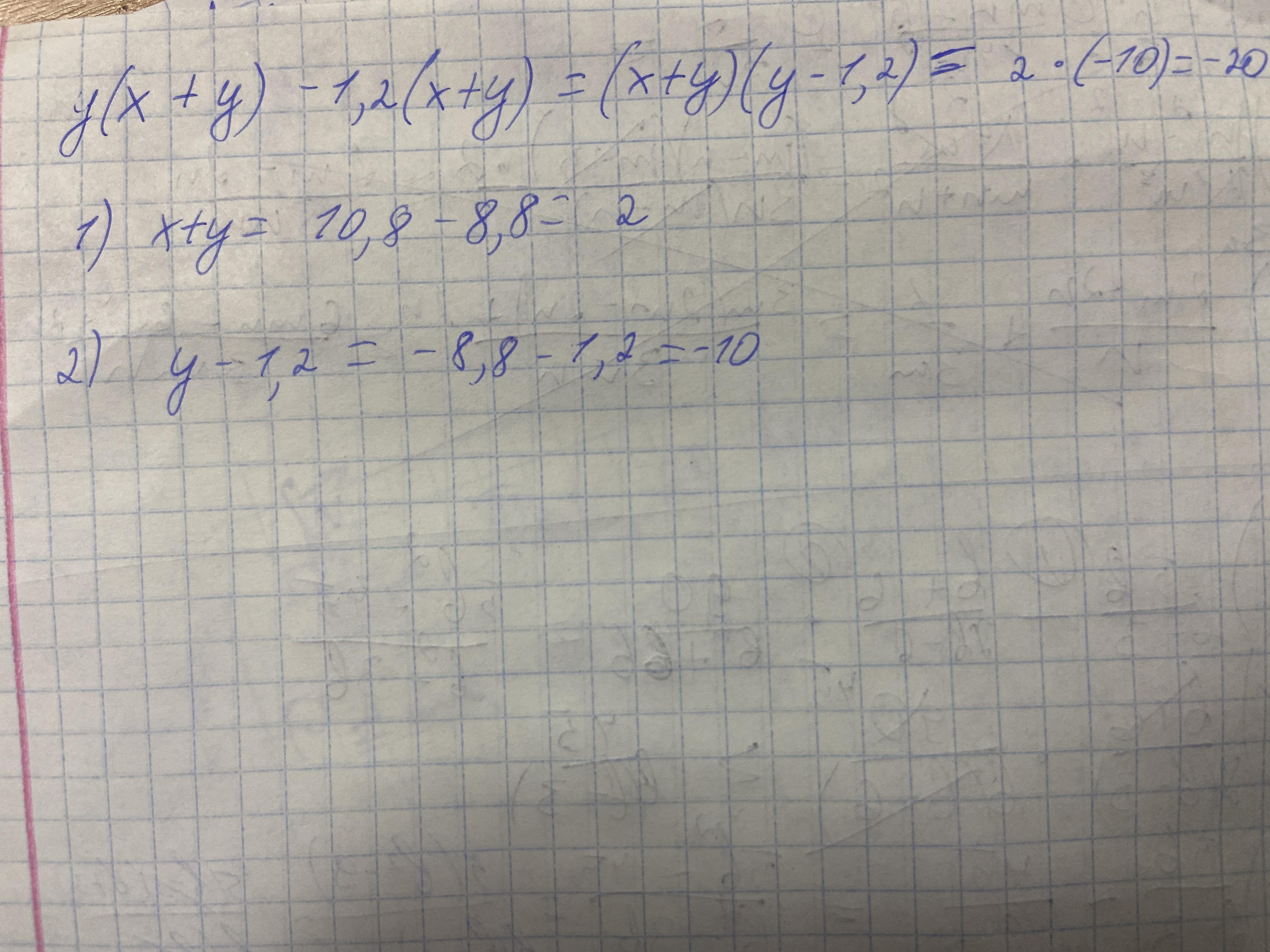 Знайдіть значення виразу, розклавши його попередньо на множники: ху + y² - 1,2х - 1,2у, якщо х=10,8, у= -8,8