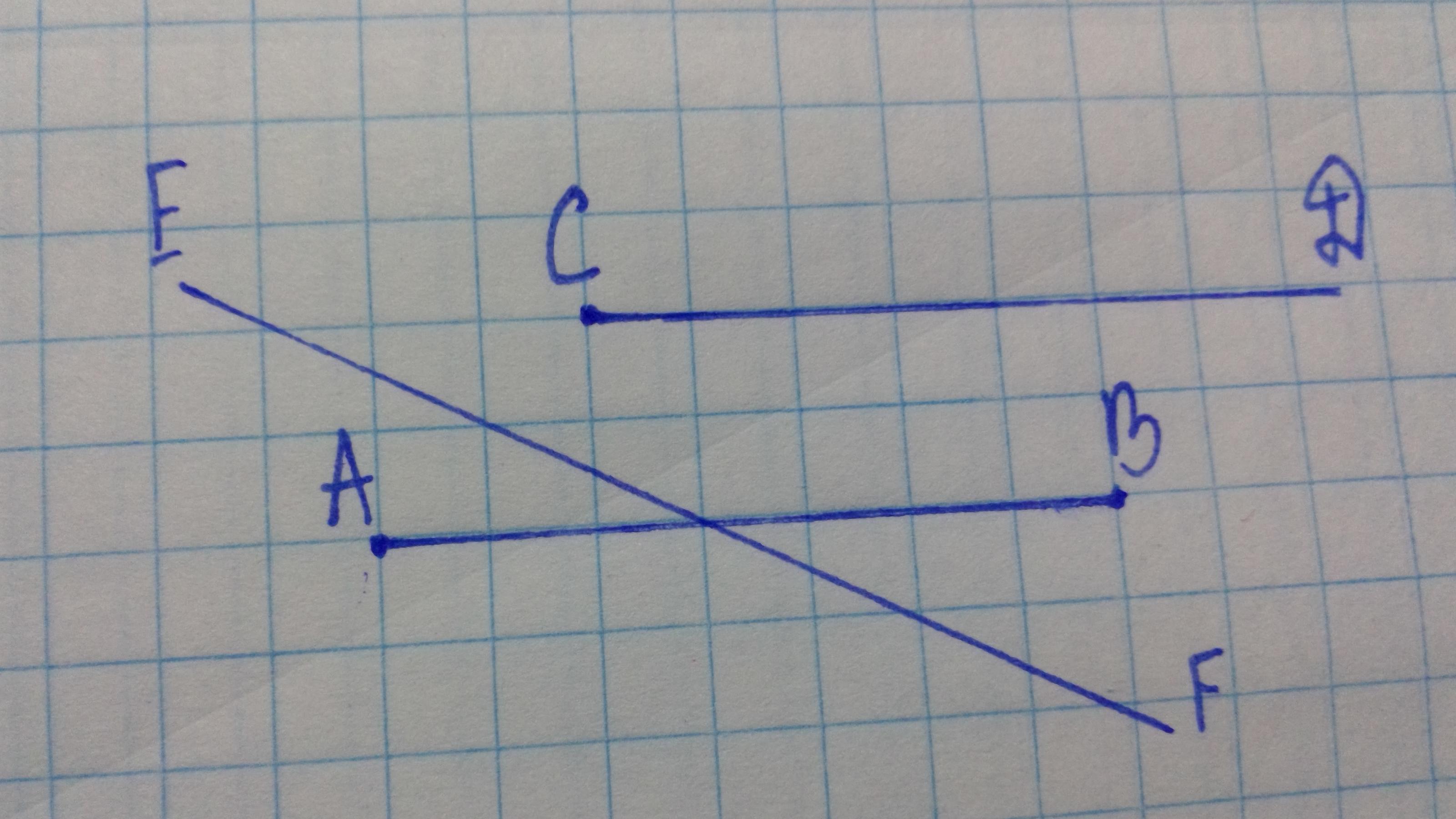 3.(3б). Накреслити вiдрiзок АВ, промінь СD і пряму EF так, щоб пряма EF перетинала вiдрiзок АВ і не перетинала промінь CD, промінь CD не перетинав відрізок АВ.