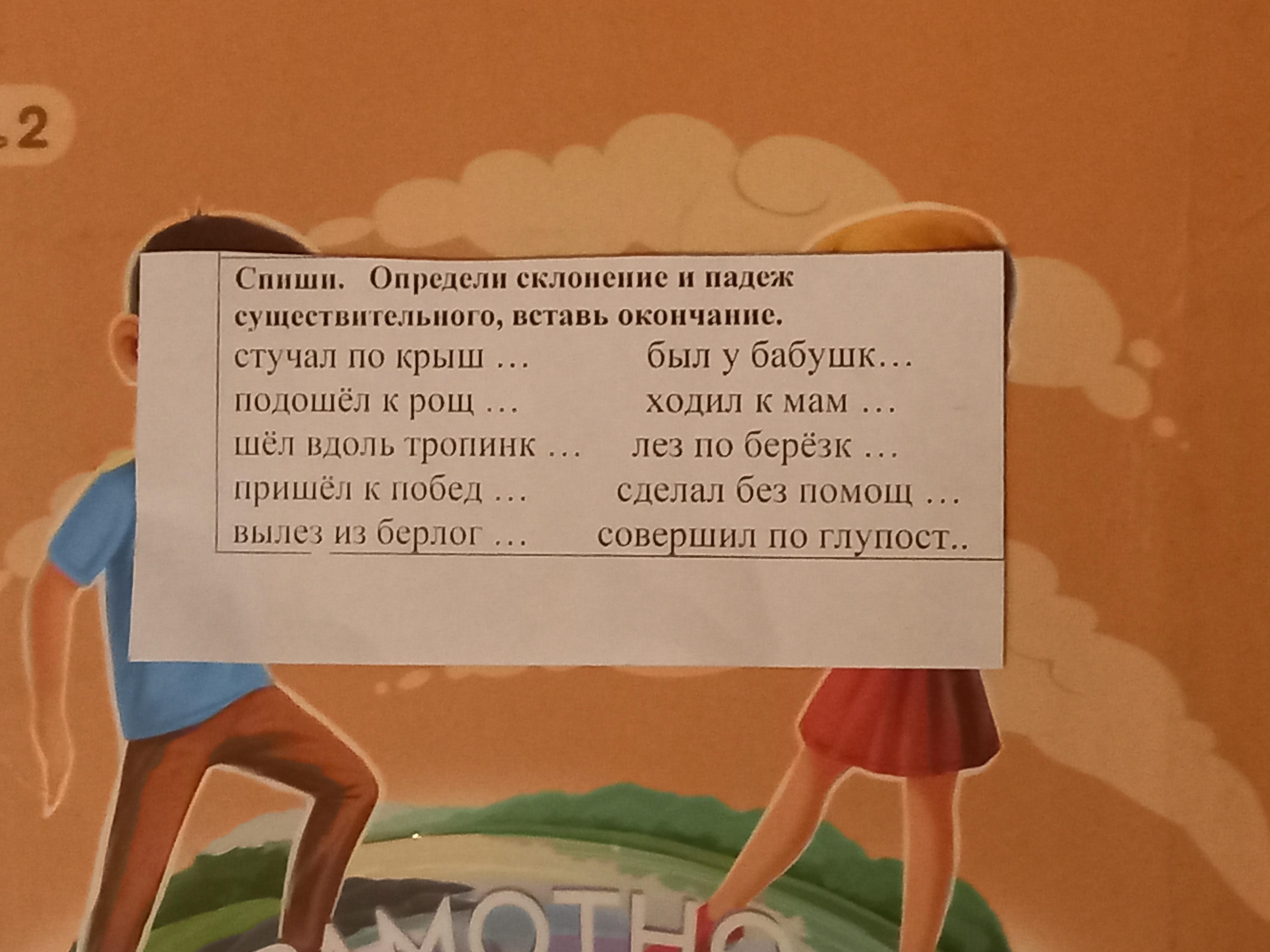 шёл вдоль тропинке (р п 1 скл) пришёл к победе (д п 1 скл) вылез из берлоги (р п 1 скл) был у бабушки (р п 1 скл) ходил к маме ( д п 1 скл) лез по берёзке ( д п 1 скл) сделал без помощи ( р п 3 скл совершил по глупости ( п п 3 скл)