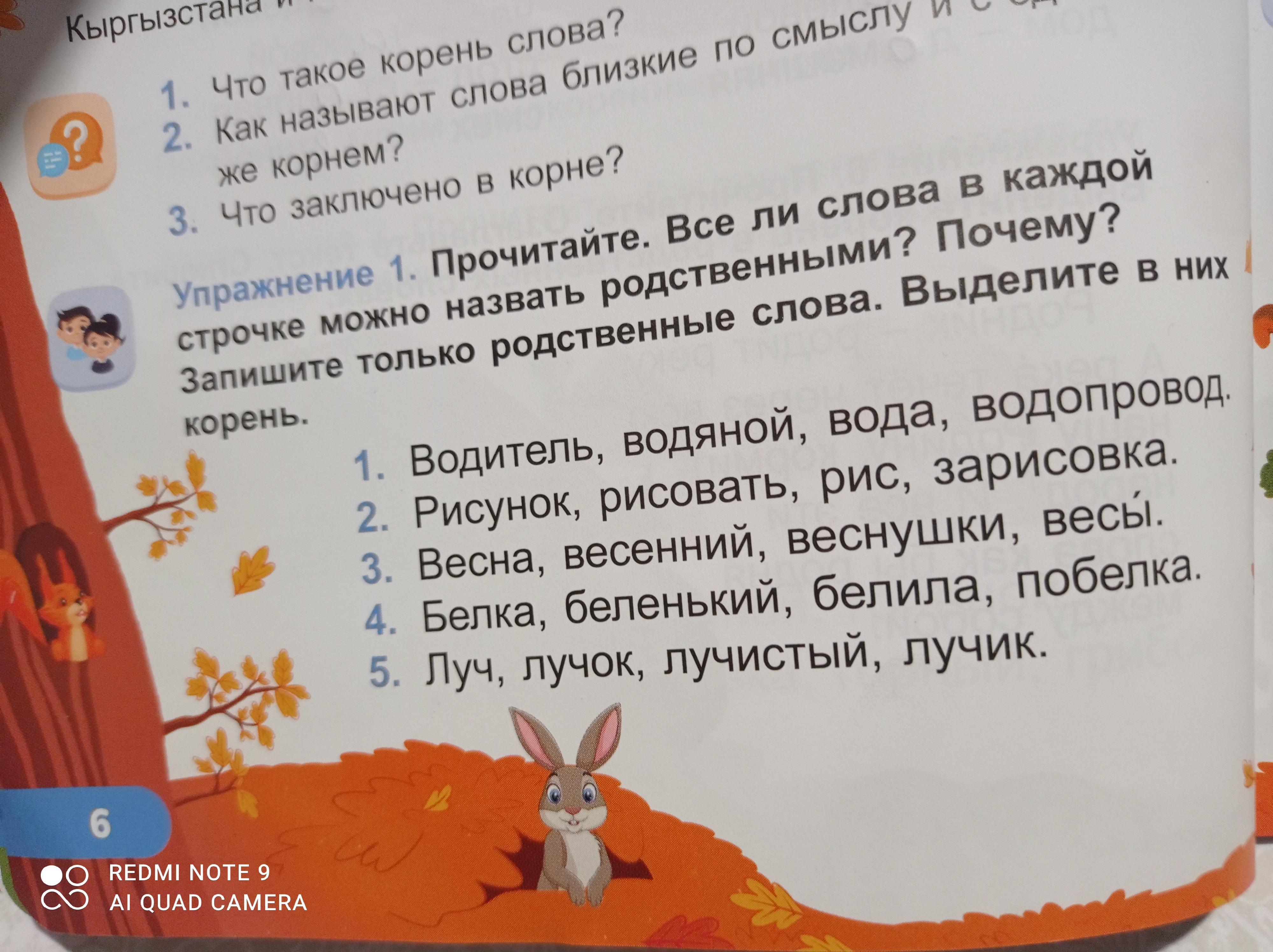 1.Водяной,вода,водопровод корень вод2.Рисунок,рисовать,зарисовка корень рис3.Весна,весенний,веснушки корень вес4.беленький,белила,побелка корень бел5.Луч,лучистый,лучик корень луч