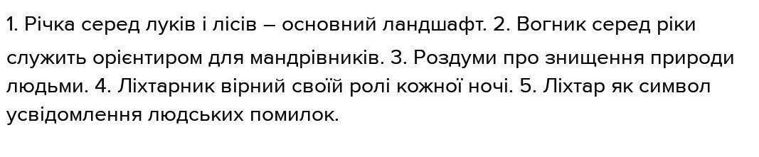 КОНТРОЛЬНИЙ ПЕРЕКАЗ ТЕКСТУ лихтарник(6 клас) План 1. Повновода і глибока річка текла серед луків і дрімучих лісів. 2. До світанку посеред ріки блимав вогник, показуючи дорогу мандрівникам. 3. Як люди зруйнували природу. 4. Ліхтарник все одно щовечора засвічує свій ліхтар. 5. «Нехай люди краще бачать свою дурість». срочно надо написать переказ