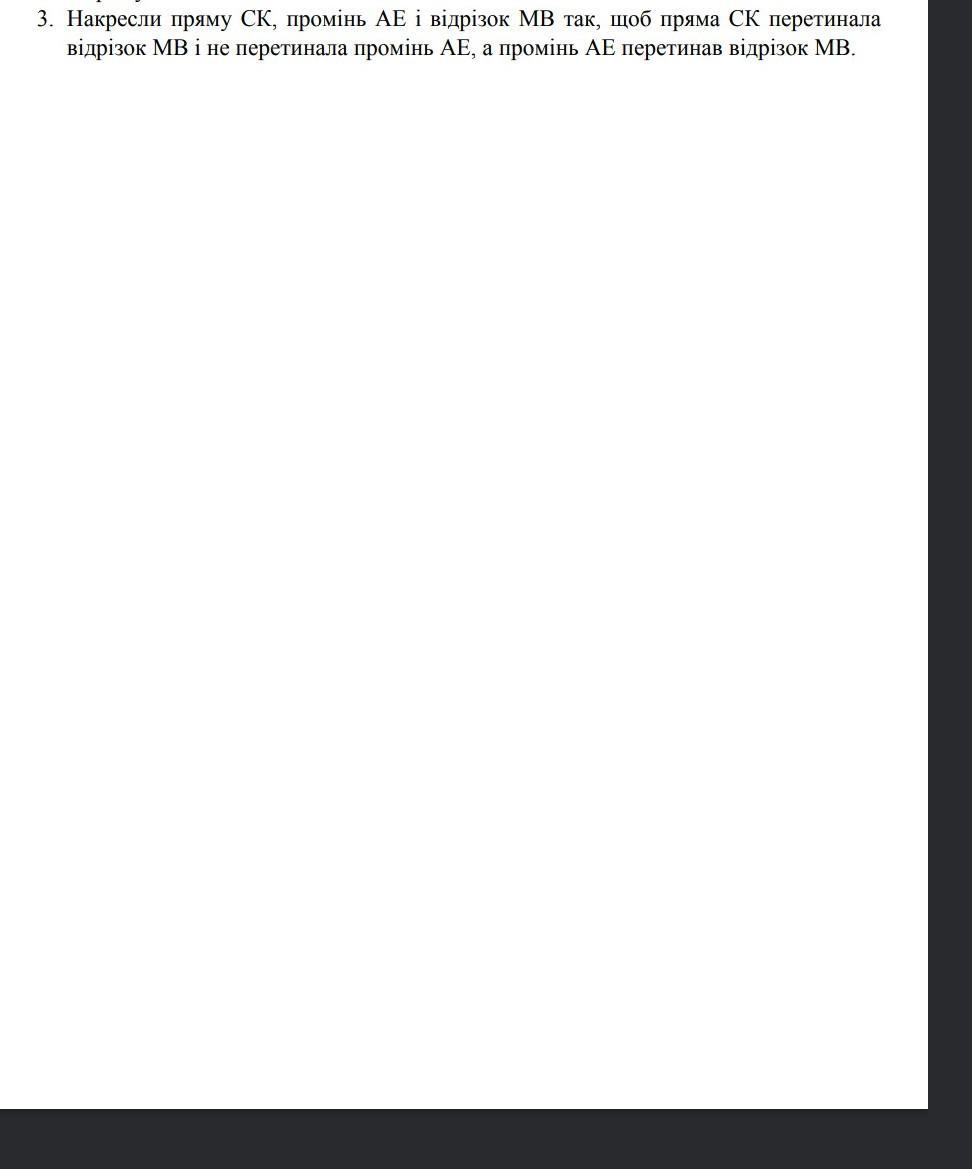 СРОЧНО❗❗❗❗❗❗ Накресли пряму СК, промінь AE і відрізок MB так, щоб пряма СК перетинала відрізок MB і не перетинала промінь АЕ, а промінь АЕ перетинав відрізок MB.