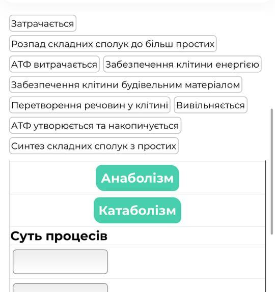 Використовуючи наведені ознаки, заповни порівняльну таблицю процесів анаболізму та катаболізму.