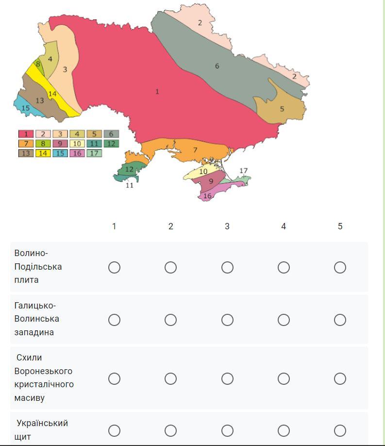 Встановіть відповідність між тектонічною структурою та цифрою, якою вона позначена на карті.