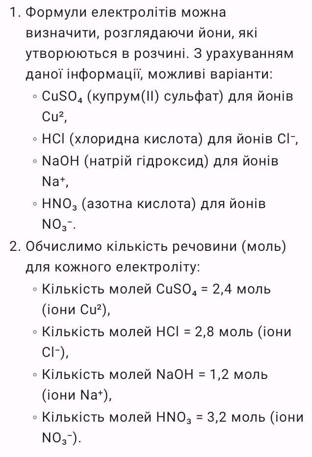 У водному розчині внаслідок розчинення трьох сполук виявили йони Cu² (2,4 моль), йони СГ (2,8 моль), йони н (1,2 моль) i йони NO (3,2 моль). 1) Визначте формули електролітів, які використали для приготування розчину. 2) Обчисліть кількість речови- ни (моль) кожного електроліту, використаного для приготування розчину.