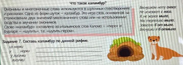 Что такое каламбур? Омонимы и многозначные слова используются в шуточных стихотворениях и рассказах. Одна из форм шуток - каламбур. Это игра слов, основанная на столкновении двух значений многозначного слова или на использовании оходства в звучании омонимов. Слово «каламбур>> составлено из итальянских слов Каломо - перо» и Бурларе - «шутить», т.е. шутить пером. Задание 7. Составь каламбур по данной рифме. из норки У У лисички лисички норки Веснушкам нему сноса: Не исчезают с носа. Я. Не жалея мыла. Нос терпеливо мыла. Зависело б от мыла. Веснушки я б отмыла .