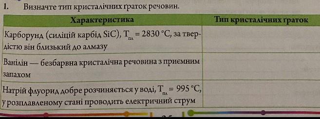 Ответ: SiC – ковалентна полярна ґратка(сполука утворена двома різними НЕметалічними елементами); C8H8O3(ванілін) – молекулярна ґратка; NaF – йонна гратка(сполука є сіллю натрія)