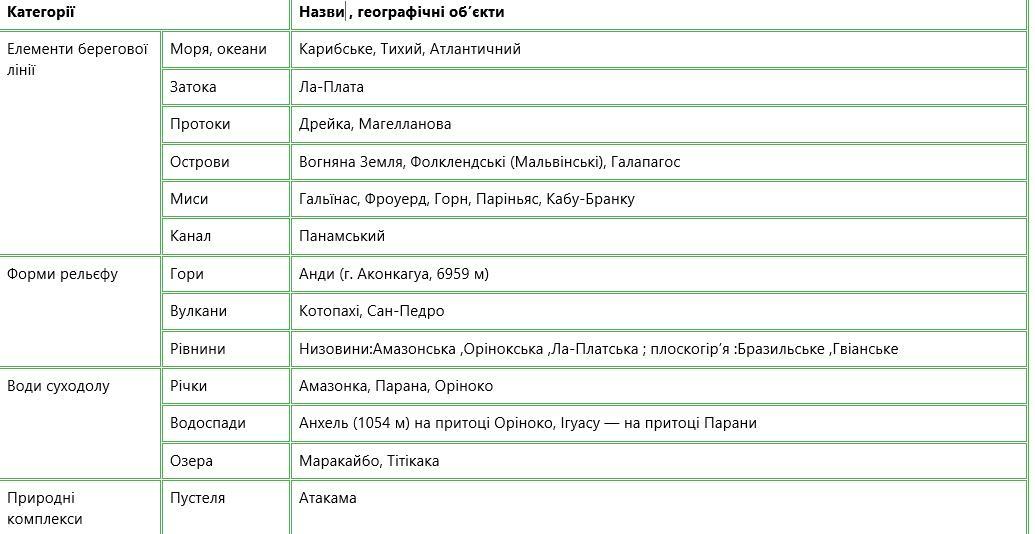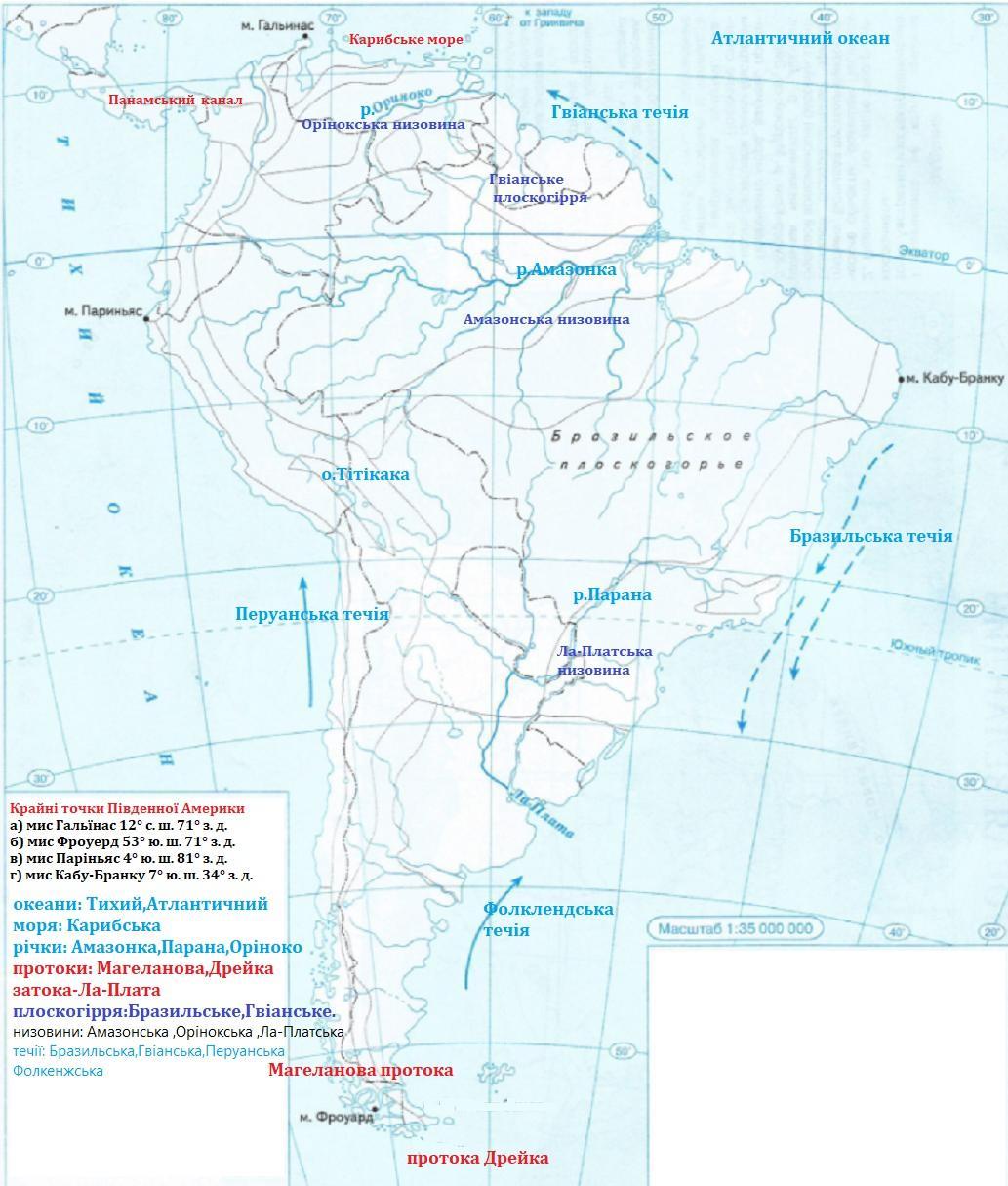 4. У конт карту на стор. 7 Фізична карта Південної Америки нанести океани, моря, затоки, протоки, течії, крайні точки, форми рельєфу материка. роботу приєднати.