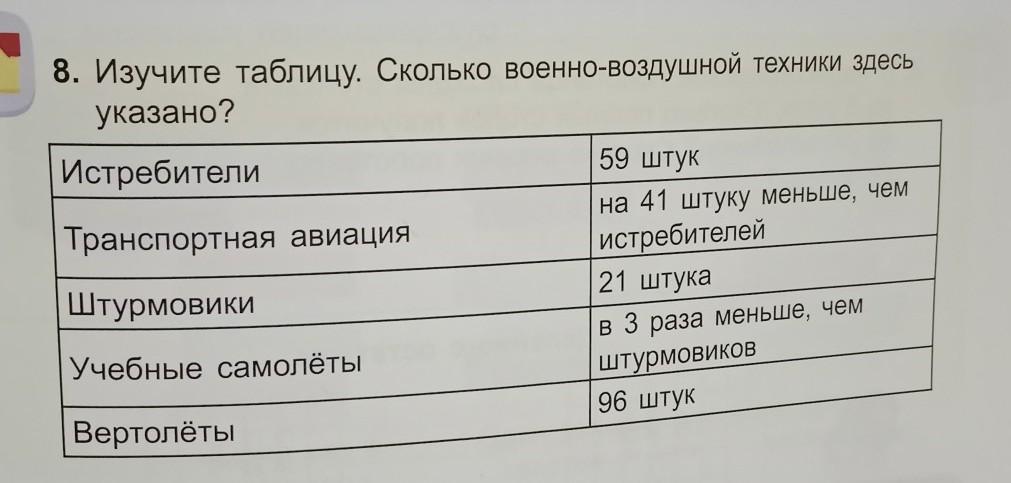 8. Изучите таблицу. Сколько военно-воздушной техники здесь указано? Истребители Транспортная авиация Штурмовики Учебные самолёты Вертолёты 59 ШТУК на 41 штуку меньше, чем Истребителей 21 штука в 3 раза меньше, чем штурмовиков 96 ШТУК