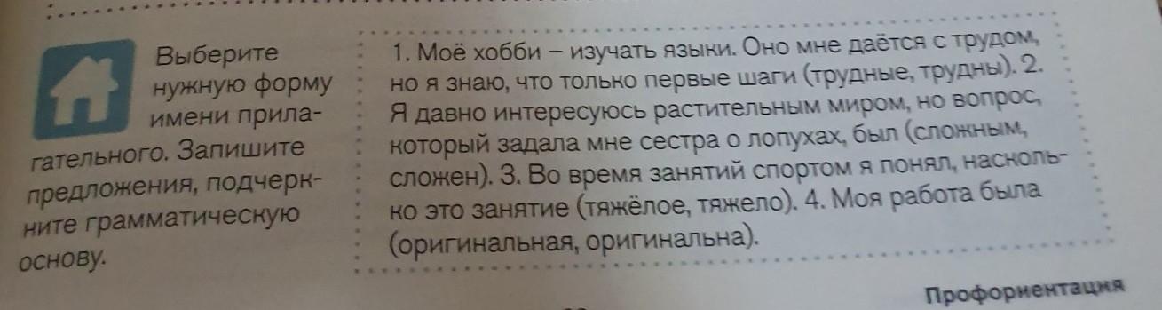 Выберите нужную форму имени прила- гательного. Запишите предложения, подчерк- ните грамматическую основу. - 1. Моё хобби - изучать языки. Оно мне даётся с трудом, но я знаю, что только первые шаги (трудные, трудны). 2. Я давно интересуюсь растительным миром, но вопрос, который задала мне сестра о лопухах, был (сложным, сложен). З. Во время занятий спортом я понял, насколь- ко это занятие (тяжёлое, тяжело). 4. Моя работа была (оригинальная, оригинальна).